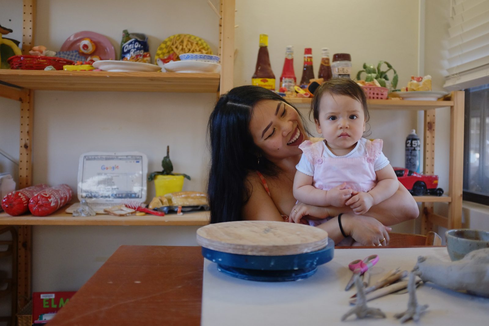 Mechelle Bounpraseuth-Barilla’s studio space is half workshop and half daycare for little baby Millie. Toys punctuate the floor, next to raw materials and half-finished pieces. The shower has been turned into a bedroom, where a colourful mobile hangs over a child-sized mattress. She tells me, with Millie in her arms, about her ceramic work growing out of a project she did with zines exploring her childhood in South West Sydney, and ideas of acceptance and unhappiness.