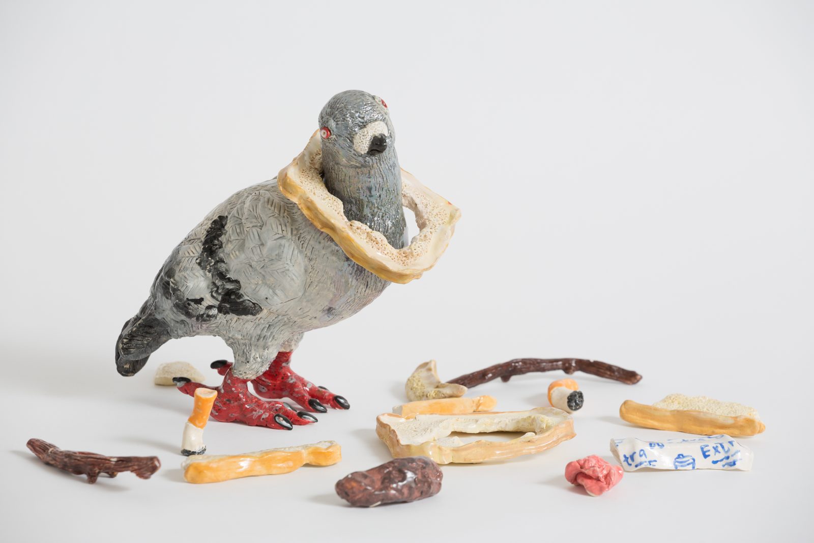 Her pieces play with nostalgia and the ideas of permanence – replicating an empty chip packet in clay. Something flimsy, worthless, and discarded, becomes a solid, permanent, art piece. There’s a stack of VHS tapes, party pies, and condiment bottles. She makes milk crates, ibises, and a pigeon eating vomit, titled ‘Friday Night’.